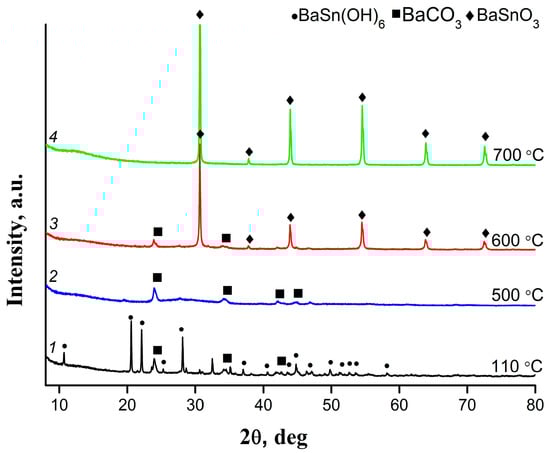 The results of diffraction studies, shown in Figure 5, agree well with the data of thermal analysis. On the diffractogram obtained after heating the sample at 500 °C, i.e., after complete dehydration of the sample, there are only reflections related to the BaCO3 witherite phase, which was initially contained in the sample (Figure 5, curve 2). Consequently, the dehydration products, BaSnO3 and SnO2, formed as a result of reactions (4) and (5) at this temperature are X-ray amorphous.