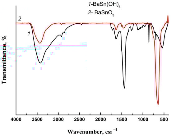 The analysis of FT spectra of the synthesized compounds allows us to confirm their composition and some features of their structure. The characteristic bands in the spectra were identified based on the literature data [,]. The FTIR spectra of the obtained samples of barium hydroxanthanate BaSn(OH)6 (Figure 7, curve 1) and barium stannate BaSnO3 (Figure 7, curve 2) agree with those obtained earlier []. The spectrum of BaSn(OH)6 clearly shows a broad band in the region of ~562 cm−1 corresponding to the vibrations of Sn-O bonds. The absorption band in the frequency region of ~750 cm−1 is characteristic of bonds of more than one type of Ba-O and Sn-O-Ba groups. A series of bands in the 875–980 cm−1 region corresponds to deformation vibrations of Sn-OH groups having partially ionic character [,]. The appearance of bands at ~1475 and 1254 cm−1 indicates the presence of carbonate impurities in the sample, and the presence of these peaks at different frequencies can be explained by the conjugate motion of C-O and C=O bonds. Carbonates, mainly BaCO3, can also be formed as a result of the absorption of carbon dioxide from the atmosphere directly during FTIR spectra []. The broad absorption of medium intensity at 1630–1750 cm−1 definitely indicates the presence of water, while the broad band of valence vibrations ν(OH) in the region at ~3410 cm−1 shows the presence of hydroxyl groups in the composition of the obtained BaSn(OH)6 precursor (Figure 7, curve 1).