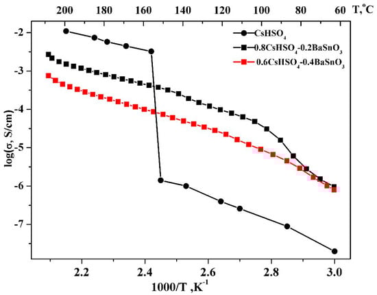 Accordingly, the magnitude of the conductivity jump at the phase transition decreases with increasing x; the conductivity jump due to the phase transition becomes much smoother and shifts to the temperature region of ~85 °C. The shift of the phase transition temperature indicates the stabilization of the high-temperature phase in the low-temperature region. The proton conductivity of the composite 0.8CsHSO4-0.2BaSnO3 is 3 × 10−3 S/cm−1 at 160 °C. With further growth of the additive fraction up to x = 0.4 (28.3 vol.% of BaSnO3), the conductivity decreases both in the high-temperature and low-temperature regions. The activation energy of conductivity decreases to 0.47 eV. The superionic phase transition completely disappears, and there is only a slight change in the slope at 85 °C on the temperature dependence. The conductivity of the high-temperature phase decreases with increasing additive fraction by an order of magnitude at x = 0.2 and by about 1.5 orders of magnitude at x = 0.4 (see Figure 8). The observed composite effect is similar to (1 − x)CsHSO4-xSiO2 (or TiO2) systems; however, the conductivity enhancement is somewhat different [,,].