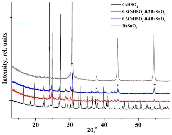 X-ray diffraction data (Figure 9) show that the diffraction pattern of the composite may be represented as a sum of contributions of individual phases. The structure of the CsHSO4 salt is preserved in the composite systems with a significant decrease in the intensity of reflections and their significant broadening, which may be caused by the dispersion and partial amorphization of the salt in (1 − x)CsHSO4-xBaSnO3 composites due to the surface interaction between acid salt and the additive. With the increase in the additive fraction in the composites, the X-ray diffraction contribution of BaSnO3 (marked with an asterisk) becomes more pronounced.