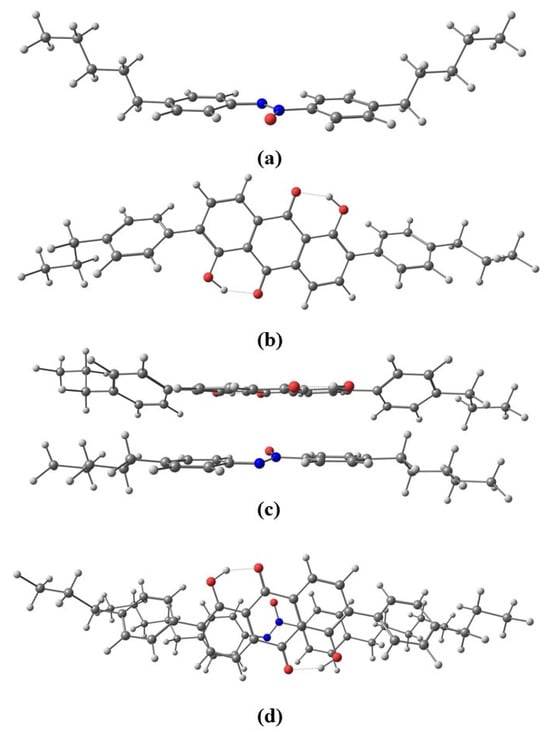 Optimized structure of (a) D5AOB nematic LC, (b) 23B3OH dye, (c) LC–dye complex side view and (d) LC–dye complex top view. All structures are calculated at APFD/6-311++G(d,p) level of theory.