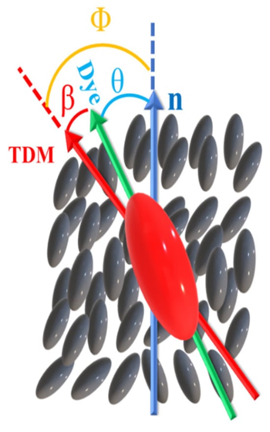 The schematic illustration of a dye molecule (green) inside a host nematic liquid crystal (blue). The director, n, provides the average orientation of the host molecules, and the relative orientations of the dye’s long molecular axis (green) and its TDM (red) are given with the specified angles.