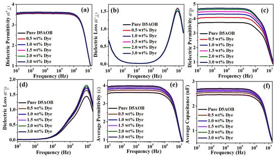 Dielectric spectroscopy was performed in order to obtain better insights into the molecular dynamics of the LC–dye composites and to yield information about the orientation of molecular dipoles present in the guest dye molecules in the host LC system. Figure 3 illustrates the dielectric spectra corresponding to homogeneously aligned (HA) and vertically aligned (VA) dyed-LC cells as a function of frequency. Figure 3a,c show the variation in perpendicular and parallel components of dielectric permittivity , respectively, as a function of frequency for the pure and dye-dispersed D5AOB systems. The figures express three distinct features: (i) the amount of permittivity and dielectric loss have both increased with an increasing concentration of dye in the system for HA as well as VA cells with a greater upsurge for VA cells as compared to HA ones; (ii) the dielectric anisotropy has increased significantly by 4.7-fold from 0.23 (for pristine nematic LC cell) to 1.10 (for optimum concentration, i.e., 3.0 wt% dye); and (iii) a shift in the relaxation frequency has taken place towards the longer-frequency edge from 0.70 MHz to 1.10 MHz for the parallel component. Also, the average permittivity intensifies with the rise in dye concentration in the composites, as can be seen in Figure 3e. The enhancement of average permittivity points towards augmentation of capacitance of these systems, as illustrated in Figure 3f.