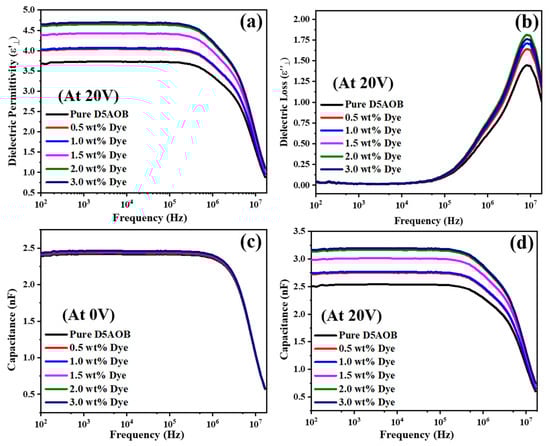 (a) Dielectric permittivity and (b) dielectric loss for homogeneously aligned LC cells at 20 V; capacitance of LC device as a function of frequency for pure and dye-blended systems (c) at 0 V and (d) at 20 V.