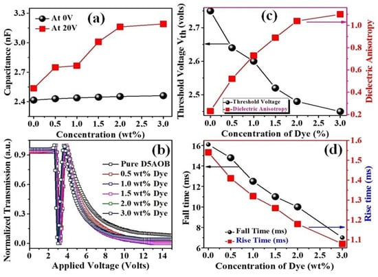 The capacitance of a system describes its capability of storing the charges. It has been observed that the addition of dye increases the effective capacitance of the nematic system. Figure 5a depicts that the capacitance of the nematic dye composite increases with an increasing dye concentration in the host D5AOB NLC. To ensure this, V-T curves of dye-blended LC cells were measured at room temperature (RT) and are depicted in Figure 5b, which shows the decrement in threshold and operating voltage of the LC cells as apparent from the shifting of curve towards a lower-voltage edge under the influence of an increasing concentration of the dye in the system. The determination of the threshold voltage was performed using different techniques already discussed in our previously published articles [,], and a remarkable reduction of around 11% has been observed in them from 2.75 V for pristine D5AOB cell to 2.45 V for that containing the optimum concentration (3.0 wt%) of dye. The changes in threshold voltage and dielectric anisotropy with concentration of dye into the composites are shown in Figure 5c. This lowering of the threshold voltage and a substantial enhancement in the dielectric anisotropy also direct towards a decrement in .