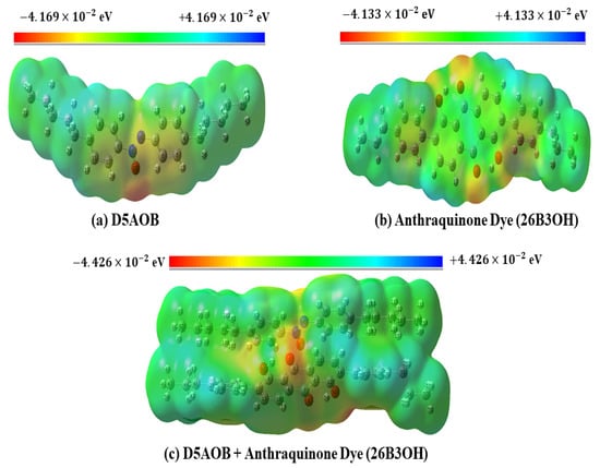 The calculated result for the optical parameters shows no significant improvement between the two functionals. Thus, the less computationally expensive wB97XD can be used to for the investigation of the optical properties of liquid crystals. Quantum chemical calculations owe much value to the charge distribution of the molecules due to the fact that dipole moment, polarizability and many other parameters are correlated with the atomic charge strongly. The statistics about three-dimensional charge distributions and its net electrostatic effect on a molecule can be yielded and represented by a molecular electrostatic potential (MESP) diagram of the systems. It maps electrostatic potentials onto the constant electron density surface. It predicts how interactions occur between the molecules, helps in the analysis of the nature of bonding between them and assesses the reactivity of molecules towards positively or negatively charged reactants. The MESP maps for the pure D5AOB molecule, pure anthraquinone dye (26B3OH) molecule and that for D5AOB + 26B3OH are illustrated in Figure 6a–c, respectively, where the respective color schemes from deepest red to deepest blue are also shown.