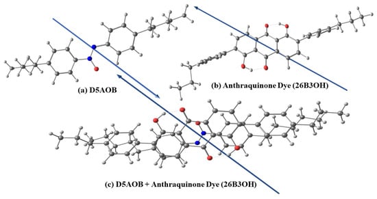 Density functional simulations were performed to investigate the structure and linear and nonlinear optical properties of the liquid crystal D5AOB, 26B3OH anthraquinone dye and their complex. Since the structure of D5AOB is already known, its input structure was taken from the PubChem repository (CID: 10736623). The structure of 26B3OH dye was built by using Gauss view 5.0 software []. These structures represent gas phase D5AOB and 26B3OH dye molecules. To study the interactions and possible structure between two molecules, a gas phase simulation is sufficient. As such, we optimized both structures to minimum energy at the wB97XD/6-311++G(d,p) and APFD/6-311++G(d,p) levels of theory using the Gaussian 16 program package []. The functional wB97XD is a range-separated function known accurately to predict energies especially when non-covalent interactions are involved. In addition to that, it includes Grimme’s D2 dispersion model, which additionally improves its performance to predict non-covalent interactions. These interactions play important role in envisaging the correct structure of the molecules having several electronegative elements such as LC and dye involved in this work. A more accurate description of the structures and energies can be obtained by using a double-hybrid functional APFD, which is a nine-parameter functional that uses spherical atomic model to calculate dispersion interaction. Therefore, it avoids artificial long-range attractive forces that are present in other DFT functionals due to their design. An APFD can calculate the bond length as accurately as the CCSD(T)/aug-cc-PVTZ level of theory, which is very close to the experiments []. Basis set 6-311++G(d,p) is adequate for elements up to the third row of the periodic table. Also, due to a lack of computational facility, we cannot test a basis set larger then set 6-311++G(d,p), but together, these two theory levels are sufficient to provides near experimental accuracy [,]. To build the structure of the dye–LC complex, we arranged the LC and Dye structure in such a way that rings in LC and dye stack on top of each other. The input structure of the dye–LC complex is shown in Supplementary Information Figure S1. In such a structure, we aim to simulate the stacking interactions, and these were optimized similarly as well. After the optimization, analytical frequency calculations were performed at the same level of theory to infer the nature of optimized structure. All the structures have positive frequencies only. Thus, they represent minimum energy structures. Optimized structures are shown in Figure 1. UV-Vis spectra were calculated from the optimized structure by applying Tamm–Dancoff approximation. Polarizability and dielectric constants were calculated at the default setting using the “polar” keyword as implemented in Gaussian 16.