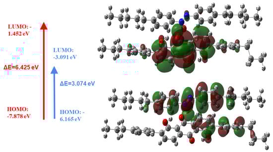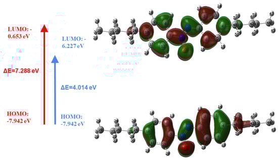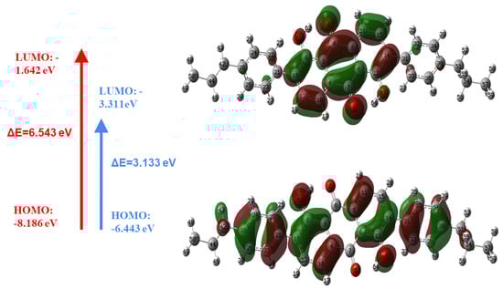The molecular orbital transitions between HOMO and LUMO are presented in Figure 8, Figure 9 and Figure 10. The energy gaps between the HOMO and LUMO of D5AOB and 26B3OH molecules were calculated using DFT with the wB97XD/6-311++G(d,p) and APFD/6-311++G(d,p) level of theory. The energy gap is considerably answerable for the charge transfer, chemical reactivity and thermodynamic stability of molecules []. The different quantum chemical parameters [] used to describe the chemical reactivity of the systems, such as chemical hardness , softness , electronegativity , electronic chemical potential and index of electrophilicity , have been calculated using the relations given in Equations (9)–(13) and tabulated in Table 3:
