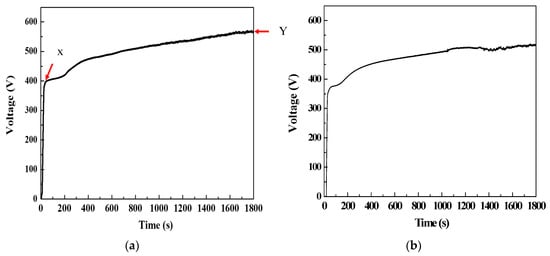There are multiple parameters that can be altered during the micro-arc oxidation (MAO) process. The electrolyte utilized has a significant influence on the resulting MAO film. Figure 2 displays the voltage–time graph of both the 7075 aluminum alloy and the Al-C6-30% specimen with an MAO film. It is evident that the voltage experiences a rapid and linear increase in the initial period, with a large quantity of bubbles emerging on the specimen surface due to the creation of a porous columnar passivation layer during the anodic treatment []. The significant changes occurred when the voltage approached point "X" on the curve, and a white spark was observed on the specimen.