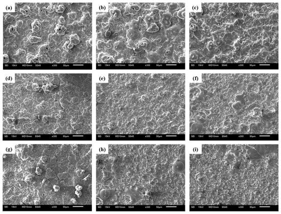 The surface morphology and microstructure of the micro-arc oxide film are strongly influenced by the plasma discharge behavior. The surface morphology of the film under different electrical parameters in sodium aluminate is shown in Figure 3. Distinct muffin structures and large fluctuations can be observed at low-duty cycles (Figure 3a,d,g). The muffin structure is the channel left by the discharge during the micro-arc oxidation process []. It can be seen from Figure 3 that the arc attacks the oxide film at the weaker point, and the film is remelted at the low-duty cycle. The remelted film solidifies to grow up, and the arc is transferred to other weak points []. The film grows more uniformly and flatter at relatively high duty ratios with longer discharge times, as shown in Figure 3c,f,i.