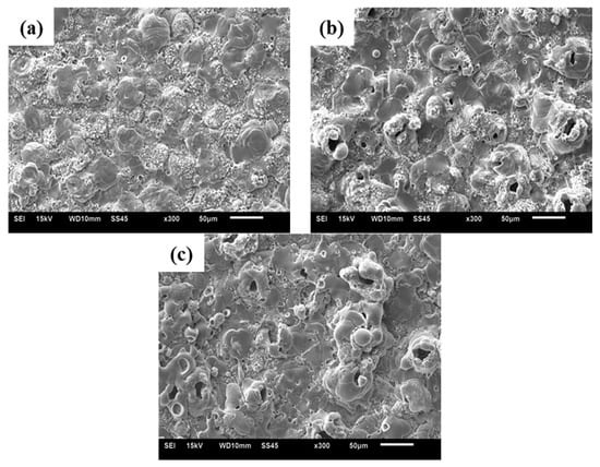 It is evident from Figure 3 that as the cathode current increases, the muffin structures decrease gradually, giving way to numerous small holes on the surface. These small pores develop due to the escape of oxygen ions () to the film’s surface under the effect of a strong negative bias electric field. Hence, with the application of a sufficiently large cathodic current, an abundance of dense small pores emerges on the film’s surface to replace the muffin structures [,].