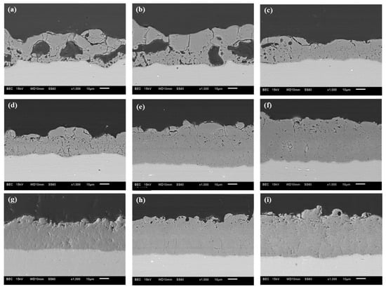 Cross sectional images of MAO films (a) Al-C2-10%, (b) Al-C2-30%, (c) Al-C2-50%, (d) Al-C6-10%, (e) Al-C6-30%, (f) Al-C6-50%, (g) Al-C10-10%, (h) Al-C10-30%, and (i) Al-C10-50%.