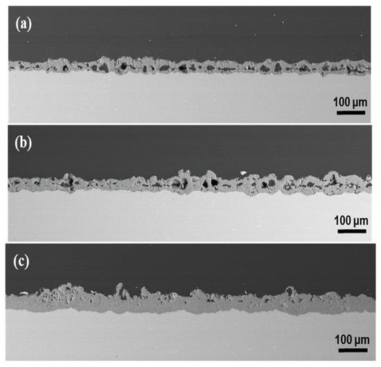 It is clear from the cross-sectional images (Figure 6) that increasing in the duty cycle is beneficial to the growth of the film and effectively reduces the pore size in the film. The discharge time is longer at higher duty cycles, and the film grows more uniformly and flatly []. The results correspond to the surface morphology in Figure 4. As the cathode current density is increased, the density of the film is obviously improved. These small holes come from the oxygen trapped in the molten oxide, and the size of the pores is not more than 1 micron. However, oxygen has high solubility at high temperatures and pressures and should be dissolved in the molten oxide [,]. If the arc duration is short at the low-duty cycle, the undissolved and trapped oxygen will rapidly cool and solidify, leaving holes in the molten oxide.