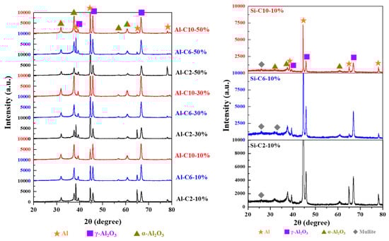 The composition of the film in the sodium metasilicate system predominantly consists of γ-Al2O3 with a minor quantity of α-Al2O3 and mullite (Al6Si2O13) crystal phase. The robust Al phase detected in the Si-C2-10% film is primarily due to its thin film thickness and hole existence. In contrast, the mullite phase mainly emerges at the diffraction angles of 26°, 33°, and 35°, among others, which may be due to its negligible concentration or an insignificant peak in the non-crystalline state. Furthermore, upon comparison with the sodium aluminate system, it is evident that the low-angle region of the sodium metasilicate system exhibits broad and truncated peaks, suggesting the presence of the amorphous state in a certain portion of the system [,,].