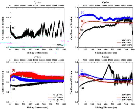 Friction coefficient–sliding distance diagram for (a) 7075 aluminum alloy, (b) Al-C2-10%, (c) Al-C6-10%, (d) Al-C10-10%, (e) Al-C2-30%, (f) Al-C6-30%, (g) Al-C10-30%, (h) Al-C2-50%, (i) Al-C6-50%, and (j) Al-C10-50%.