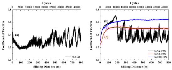 Friction coefficient–sliding distance diagram for (a) 7075 aluminum alloy, (b) Si-C2-10%, (c) Si-C6-10%, and (d) Si-C10-10%.