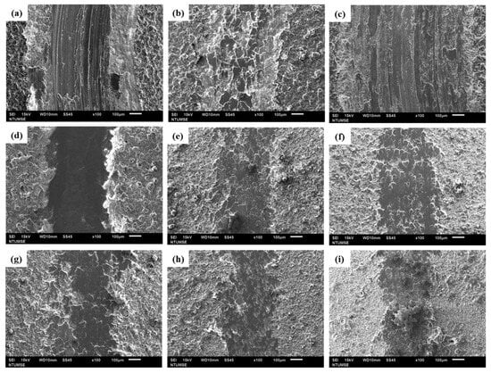 Wear track of the MAO film: (a) Al-C2-10%, (b) Al-C2-30%, (c) Al-C2-50%, (d) Al-C6-10%. (e) Al-C6-30%, (f) Al-C6-50%, (g) Al-C10-10%, (h) Al-C10-30%, and (i) Al-C10-50%.