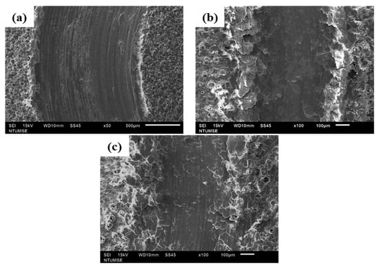 Wear track of the MAO film: (a) Si-C2-10%, (b) Si-C6-10%, and (c) Si-C10-10%.