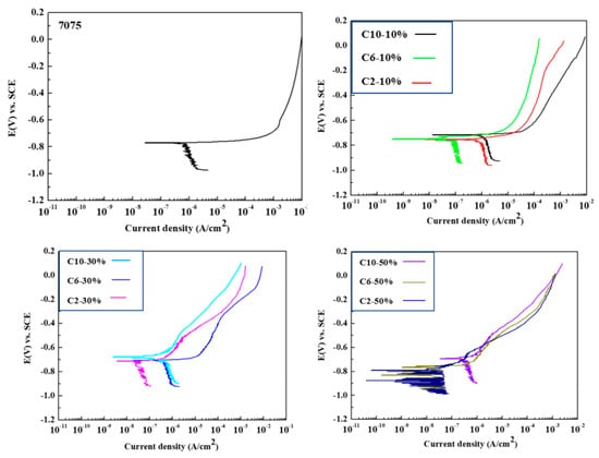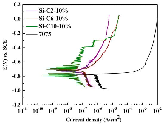 Due to the increased film thickness and reduced number of defects, the film demonstrates passivation behavior in the anode area due to its greater resistance to corrosion. In particular, the Ecorr and Icorr of 7075 substrates are −0.777 VSCE and 1.44 × 10−6 A/cm2, respectively. It can be deduced from Table 9 that an increase in cathode current density and the duty cycle results in a decrease in corrosion current value, indicating an enhancement in the film’s corrosion resistance [,]. A greater current density leads to the formation of a more condensed film, thereby ameliorating its corrosion resistance. When comparing the corrosion resistance based on the size of the corrosion current, the results indicate that Al-C10-50% > Al-C6-50% > Al-C10-30% > Al-C6-30% > Al-C2-50% > Al-C2-30% > Al-C10-10% > Al-C6-10% > Al-C2-10%. Additionally, Figure 13 demonstrates that the Si-C10-10% film possesses the best corrosion resistance within the sodium metasilicates system.