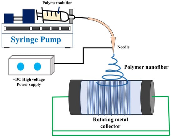 Electrospinning has gained recognition for its ability to create scaffolds that mimic the extracellular matrix (ECM), making it a valuable addition to conventional scaffold-production techniques such as gas foaming, solvent-casting, fibre bonding, freeze-drying, particulate leaching, etc., [66,67]. Electrospinning is a highly versatile and cost-effective process that produces long, continuous fibres with diameters ranging from 10 nanometres to some micrometres, achieved by applying high electrical voltage [68,69,70]. A typical electrospinning setup as depicted in Figure 1 comprises four main components: a high voltage source, a spinneret (typically a hollow metal needle), a collector (grounded or negatively biased), and a syringe pump [71,72,73]. The syringe pump is employed to propel a polymer solution or melt through the spinneret. As the polymer liquid (solution or melt) is subjected to a high electrical potential, electric charges build up on the face of the liquid drop at the tip of the needle [71,74,75].