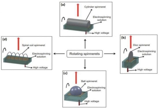 Schematic diagram depicting the (a) cylinder spinneret, (b) disc spinneret, (c) ball spinneret, and (d) wire/coil spinneret in needleless electrospinning [97].