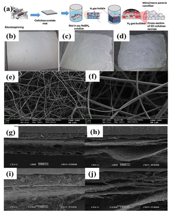 (a) Overall synthesis process of 3D cellulose sponge, (b) 2D cellulose mat, (c) regenerated cellulose mat, (d) 3D cellulose, (c,d). Digital images of showing images of (a) CA mat, (b–d) showing the conversion of 2D cellulose mat into 3D cellulose sponge, (e,f) FE-SEM images of 3D cellulose sponge at different magnifications, (g,h) cross-section images of 2D, and (i,j) cross-section images of 3D cellulose sponge [3]. Reprinted with permission from Carbohydrate Polymers. Copyright © 2015 Elsevier Ltd.