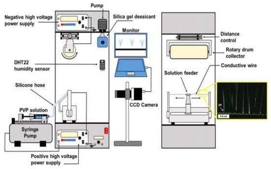 The introduction of co-axial electrospinning has played an important role in the comprehensive production of various functional nanomaterials. For instance, co-axial electrospinning has enabled the efficient production of two-layer core–shell polymer nanofibers. Co-electrospinning, on the other hand, is commonly employed to fabricate single-layer and bilayer nanofibers. However, these nanofiber structures have limitations in terms of assembly configurations and functionalities [114,115]. By increasing the number of nanofiber layers, the connectivity and functionalities of composite materials can be improved. Recent research has demonstrated the fabrication of multifunctional nanofibers with more than two layers using co-electrospinning. Additionally, the needleless electrospinning system has been widely adopted by researchers to increase fibre productivity [116]. This system utilizes two high voltage sources, one connected to the rotary drum collector and the other to the conductive wire, as illustrated in Figure 4.