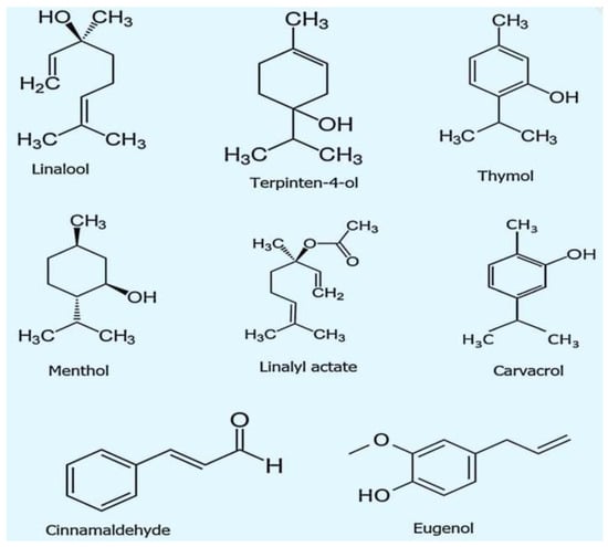 Essential oils are organic, volatile, concentrated liquids that are secreted by tiny structures in a plant’s various parts. They are also referred to as volatile oils, ethereal oils, or aetherolea. Each essential oil takes its name from the specific plant it is derived from. For example, the oil extracted from lavender flowers is known as lavender oil. These oils are a blend of natural compounds, including volatile organic compounds (VOCs) like terpenes, phenols, alcohols, and esters. Various methods such as steam distillation, cold pressing, solvent extraction, or effleurage are utilized to extract essential oils, depending on the plant and the desired outcome [127]. Different plant parts, such as flowers, leaves, stems, bark, roots, or seeds, can be used in the production process. The name “essential” was given to these oils because it was once believed that they captured the true essence of a plant, encompassing its distinctive odour, flavour, and applications due to the variety of constituents present in it. Figure 5 shows some major constituents of essential oils and their chemical structures.