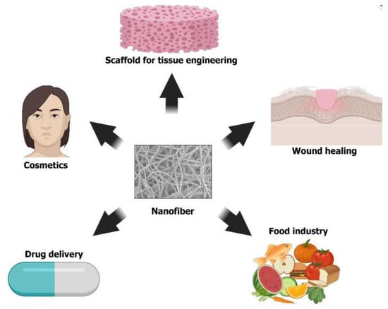 Throughout history, essential oils have been used worldwide in the cosmetics, food industry, biomedical, and aromatherapy industries, as well as various household applications [129]. Figure 6 indicates the potential applicability of essential oils infused electrospun nanofibers.