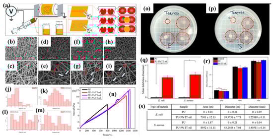 (a) Schematic representation showing the overall synthesis process of PU/TTEO nanofibers, (b–i) FE-SEM images of PU/TTEO nanofibers with 1, 3, and 5% of TTEO, (j–m) histogram showing diameter of PU/TTEO nanofibers with 1, 3, and 5% of TTEO, (n) stress–strain curve, and (o–s) antibacterial test of PU/TTEO-5% nanofibers [141].