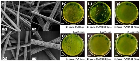 Furthermore, Milanesi et al. [142] created nano-textured fibres using PLA solutions with black pepper essential oil (BP-EO) or limonene. These porous nanofibers were then coated with chitosan, boosting antibacterial properties, biocompatibility, and support for cell adhesion and growth. Antibacterial tests on S. aureus, S. epidermidis, E. coli, and P. aeruginosa demonstrated chitosan and EOs working together synergistically. Fibers with BP-EO and limonene exhibited stronger antibacterial activity compared to pure PLA. Coated fibres outperformed uncoated ones in microbial activity, indicating chitosan’s positive impact on stopping bacterial growth in PLA-EOs fibres.