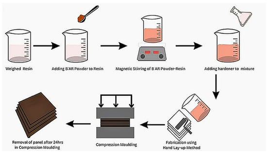 A single panel was made using 12 piles of basalt fiber, each of dimensions 290 mm × 260 mm. The epoxy resin was modified by dispersing BAR powder into it using a magnetic stirrer for 40 min at 300 rpm and 70 °C. The BAR powder proportions were chosen to be 2%, 4%, 6%, and 8 wt.% of the resin based on the study from the published literature where researchers observed a decrease in mechanical properties with higher filler proportions []. The hardener was then added to the resin just before the hand lay-up was performed (where the ratio of epoxy to hardener was fixed as 10:1). Composite panels were fabricated using hand lay-up and press-molding techniques. The hand lay-up process was performed on an open mold, after which the panel was compressed under a hydraulic press where it was left for 24 h. The required laminates were prepared by keeping the wt.% of the BF constant, whereas the resin content was varied concerning the varying BAR filler wt.% [,,]. The panel was compressed to a thickness of 2.5 mm using precisely machined shims at a compression factor of 1.4 []. After removing the panel from the press mold, it was kept aside for seven days at room temperature as a post-curing step. Using a similar technique, an additional panel without using any fillers was also prepared to evaluate the effect of the BAR powder as a filler on the mechanical properties of the composites. Figure 1 illustrates the fabrication process employed to prepare the required laminates. After fabrication, the panel surface was wiped/cleaned and named as presented in Table 1.