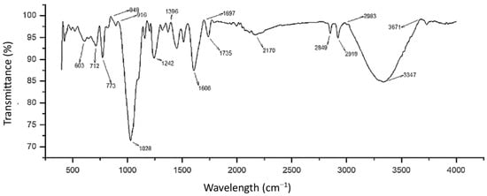 The final composite property depends upon the chemical composition of fibers and fillers and their compatibility with the matrix material. The chemical composition of basalt fiber is well established through various published studies []. However, no published study has explored the chemical composition of the novel BAR powder filler. Hence, analyzing the chemical composition of the BAR powder is important to understand the effect of the filler on the mechanical properties of the composite. The chemical constituents of the BAR powder were determined by performing a gravimetric analysis []. Constituents like cellulose, hemicellulose, and lignin were quantitatively determined by performing neutral detergent fiber (NDF), acid detergent fiber (ADF), and acid detergent lignin (ADL) procedures. The value obtained from NDF informs us about the hemicellulose, cellulose, lignin, and trace minerals of the powder. NDF provides details about the content of hemicellulose, cellulose, lignin, and minerals, while ADF provides information about the contents of cellulose, lignin, and minerals present in the BAR powder. The total hemicellulose content in the BAR powder was estimated by subtracting the value obtained using ADF from the value obtained using NDF. Similarly, the total cellulose content in the BAR powder was obtained by subtracting the ADF value from the ADL value. The lignin content was obtained through the ADL method. A Fourier transform infrared spectroscopy (FTIR) study was also performed on the BAR powder to understand the presence of specific functional groups in it.