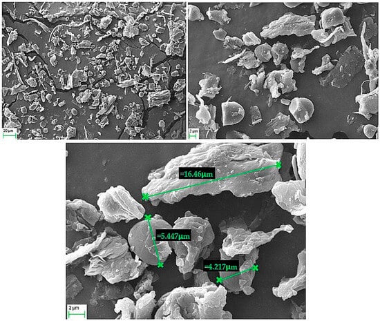 Judging from the SEM images of the BAR powder shown in Figure 3, the powder is characterized by an irregular particle shape and varied particle size. All particles exhibited sufficient surface roughness and enhanced crystallinity.