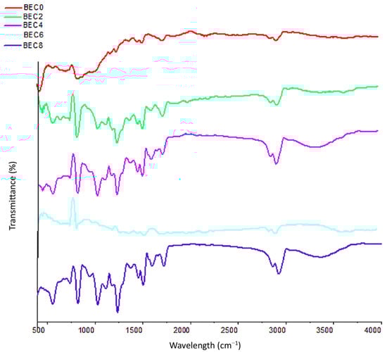 Figure 4 shows the FTIR spectra for the BAR-powder-filled as well as the unfilled BEC laminates. The addition of BAR powder resulted in the generation of additional functional groups, denoted by the presence of absorbance peaks for the BEC2, BEC4, BEC6, and BEC8 laminates in the wavelength range of 800–1800 cm−1, which are absent in the spectrum of the BEC0 laminate. The band at 1000–1100 cm−1 for the BEC2, BEC4, and BEC8 laminates indicates vibrations due to the C–N stretch, which in turn indicates a strong crosslinking reaction [].