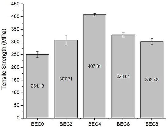 The tensile strength of the BEC laminates is shown in Figure 5. The analysis of the results indicates that the tensile strength of the BEC laminates that are fabricated with the inclusion of the BAR powder as filler is high in comparison to that of the BEC0 laminate, which was fabricated without the inclusion of the BAR filler. The maximum tensile strength was found in the BEC4 composite, about 407.81 MPa. When compared with the BEC0 composite, which had a tensile strength of nearly 251.13 MPa, the increase in tensile strength was about 62%. The composites with 2 wt.% BAR, 6 wt.% BAR, and 8 wt.% BAR showed tensile strengths of 307.71 MPa, 328.61 MPa, and 302.48 MPa, respectively, which are about 23%, 31%, and 20% stronger than that of composite BEC0. This indicates that the inclusion of BAR powder as a filler is beneficial for the improvement in the tensile strength of BEC laminates. This can be attributed to the fact that BAR powder is composed of lignin, which is known to contain several functional groups such as hydroxyls, carboxyl, carbonyl, and methyl []. Thus, the BAR powder consists of several active functional reaction sites that can react with the epoxides of the resin and metal ions of the basalt fibers and result in the formation of healthy interfaces between the matrix, filler, and fiber.