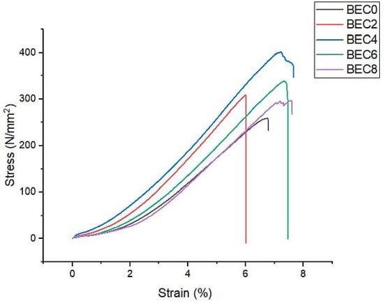 Figure 6 shows the stress–strain curve of the BEC laminates. The analysis of this plot indicates the brittle fracture of all BEC laminates, with fracture occurring between a strain of 5% and 7%. This means that the incorporation of the BAR filler rendered the BEC laminate stiff, thus improving the laminate’s resistance to deformation under the applied loads.