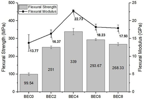 The flexural strength and modulus of the BEC laminates are presented in Figure 7. In Figure 7, an increasing trend in the flexural strength and moduli is observed for all of the BEC laminates which were fabricated with the inclusion of BAR powder, in comparison with the BEC0 laminate, which did not have BAR powder in it. The maximum flexural strength was observed in the BEC4 composite, which was about 339 MPa. When compared with the BEC0 composite, which had a flexural strength of nearly 99.54 MPa, the increase in flexural strength was about 241%. The composites with 2 wt.%, 6 wt.%, and 8 wt.% BAR powder showed flexural strengths of 251 MPa, 293.67 MPa, and 268.33 MPa, respectively, which are about 152%, 195%, and 170% stronger than the BEC0 composite. Similarly, the highest flexural modulus was observed in the BEC4 composite, which was about 22.73 GPa. When compared with the BEC0 composite, which had a flexural modulus of nearly 13.77 GPa, the increase in flexural modulus was about 65%. This improvement in the flexural strength and moduli of the BAR-filled BEC laminates can be understood through the FTIR spectrum of the BAR powder, as shown in Figure 2. The presence of the FTIR spectrum band at 1735 cm−1 indicates the presence of an ester C=O bond, which is a strong and stable bond []. Such bonds lead to the creation of stronger interfaces with the resin and result in improved flexural properties. Also, the lignin in the BAR powder constitutes various reactive elements such as hydroxyl and methoxy groups, which were confirmed by peaks at 2919 cm−1 and 3347 cm−1 in the FTIR spectrum. Such reactive functional groups tend to bond to the epoxides of the epoxy resin, resulting in the generation of stronger interfaces. This is the reason there are published reports suggesting the use of lignin-based curing agents for epoxy resins []. However, the improvement in flexural strength and moduli of the BAR-filled BEC laminates follows the typical trend; the improvement is observed for the BEC2 and BEC4 laminates, and the trend reverses for the BEC6 and BEC8 laminates. This may be due to the increased viscosity of the resin at a higher wt.% addition of BAR powder. Also, due to depleting resin content at a higher wt.% loading of the BAR powder, the active functional groups of the BAR powder do not receive enough epoxide rings to react with and generate stronger interfaces. This may be the reason the flexural properties tend to decrease when BAR powder inclusion is greater than 4 wt.% in the epoxy resin.