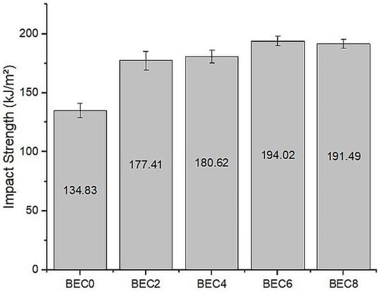 The results of the impact strength test are shown graphically in Figure 8. The analysis of the impact strength values indicates that the BEC laminate’s ability to absorb energy before fracture increases with the addition of BAR powder. The impact strength of all BEC laminates fabricated through the inclusion of BAR powder shows an increment in comparison to the impact strength value of the unfilled BEC0 laminate. The impact strength of the BEC laminates showed an increasing trend from the BEC0 laminate to the BEC6 laminate, after which a decreasing trend was observed from the BEC6 to the BEC8 laminate. The highest impact strength was observed for the BEC6 laminate, which could absorb approximately 194.02 kJ/m2 of energy before fracture. In comparison with the BEC0 laminate, an improvement of 44% in energy absorption was observed for the BEC6 laminate. The laminates with 2, 4, and 8 wt.% BAR powder filler absorbed nearly 177.41 kJ/m2, 180.62 kJ/m2, and 191.49 kJ/m2, respectively, which was about 32%, 34%, and 42% more than the BEC0 laminate. The improvement in the impact strength of the BEC laminates included BAR powder can be attributed to enhanced wettability of the basalt fibers with BAR-powder-infused resin, which resists fiber pull-out and the eventual delamination failing under impact loads []. The impact strength of a polymer composite laminate, by and large, depends upon the toughness of the matrix resin. Also, the variations in features present in different layers of the laminate due to the incorporation of fibers and fillers may give rise to different failure conditions in the intra-ply regions, which help the laminate resist delamination under impact loads []. Thus, for higher impact strength, it becomes more important to have better adhesion of plies through the generation of stronger interfaces. The inclusion of BAR powder in the epoxy resin resulted in enhancing the matrix toughness, which allowed the matrix to absorb more energy under impact loads. The presence of the BAR powder in the matrix increased the friction between the microfiller and the fibers, so it resisted the pull-out of the fibers. Also, the basalt fibers, which are more brittle compared to the cellulosic BAR powder [], were coated with the BAR-powder-infused resin, which protected the fibers against impact damage.