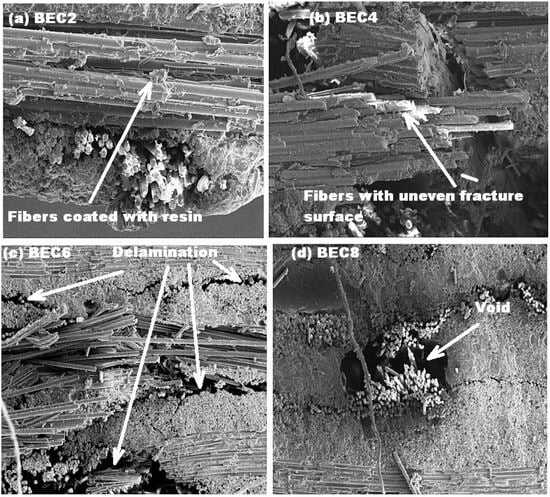 A SEM analysis was carried out to further understand the failure mechanisms involved and influencing the strength of the BEC laminates. Figure 9 shows the SEM images of the fractured BEC laminates subjected to the flexural strength test. As discussed in the aforementioned paragraphs, the BEC2 and BEC4 laminates possess better mechanical properties than the BEC0, BEC6, and BEC8 laminates due to the thorough wetting of the BAR-powder-reinforced epoxy resin with the basalt fibers. The morphology of the BEC2 and BEC4 laminates shown in Figure 9a,b indicates a fractured fiber surface that was thoroughly coated with resin. Also, the fibers were held together and the fractured surface did not show any fiber pull-out. The laminate pictured in Figure 9b is characterized by the presence of fractured fibers with uneven surfaces, indicating crack deflection during fracture []. The indication of the presence of crack deflection also reinforces the presence of stronger and stiffer interfaces between the various components of the composite laminate. This indicates that using BAR powder as a filler strengthened the resin–fiber interface. The drop in mechanical properties of the BEC6 laminate can be understood through Figure 9c. The fractured surface of the BEC6 laminate as shown in Figure 9c indicates a widespread delamination of the plies under the applied loads. This is due to the poor adhesion of the plies with each other, indicating the lack of resin between the plies. Also, the fracture surface in Figure 9c is characterized by the presence of loose, pulled out fibers, which again can be attributed to the lack of the adhesive agent, which is the resin filled with BAR powder. As the wt.% inclusion of BAR powder increases, simultaneously, the resin content decreases. This was attributed to the decrease in the mechanical properties of the BEC8 laminate. Figure 9d shows the SEM image of the fractured surface of the BEC8 laminate, which is characterized by the presence of a huge void generated due to the deficiency of the resin.