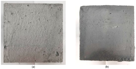 The samples presented in Figure 4 differ in color: the foam concrete sample with coal dust (Figure 4b) has a dark gray or even black color, in contrast to the lighter sample of the control composition (Figure 4a). In addition, the surface of the sample in Figure 4a has, upon visual inspection, a larger number of pores and voids visible to the naked eye, as well as some heterogeneity in different areas.