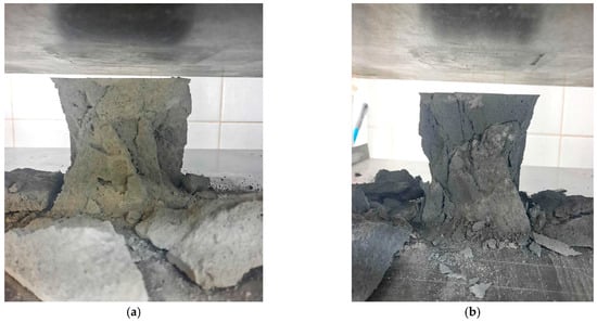 Foam concrete samples destroyed after compressive strength testing: (a) control composition; (b) composition with coal dust.