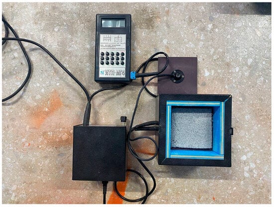 The thermal conductivity coefficient of foam concrete was determined in accordance with the requirements of the method in [55] using the ITP-MG4 device (Figure 6). Before testing, foam concrete samples were dried to constant weight, and the deviations of geometric parameters were monitored. The edges of the sample in contact with the working surfaces of the device plates were made flat and parallel.