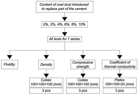 Based on these research sources, it can be noted that, among the line of cellular concrete produced in the global industry, foam concrete occupies a special place. Foam concrete produced using non-autoclave technology has a number of advantages in terms of ease of production, as well as minimizing energy costs in its production, and the possibility of conducting experiments and pilot testing of new recipes and technological solutions regarding its composition and technology [45]. At the same time, for numerous countries, especially those where coal mining is widely developed, there is a problem of the accumulation of coal dust in large quantities near populated areas. This problem increases the risk of environmental pollution and hinders the achievement of sustainable development goals [46,47].