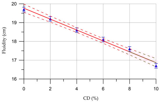 As can be seen from Figure 8, with the introduction of CD from 2% to 6%, a smooth decrease in fluidity is observed. At a CD dosage of 2%, the fluidity was 19.2 cm, which is 2.5% less than the similar indicator of the control composition. At dosages of 4% and 6%, the fluidity values were 18.6 cm and 18.1 cm, which is 5.6% and 8.1% less than the control composition. At 8–10% CD, a sharp decrease in fluidity is observed. Thus, the fluidity values at these dosages were 17.6 cm and 16.7 cm, which is 10.7% and 15.2% less in comparison with the control composition.