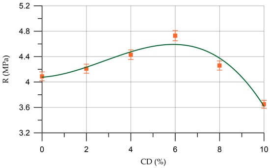Alteration in the compressive strength (R) of mixtures at different CD dosages is approximated by Equation (5) with a coefficient of determination R2.