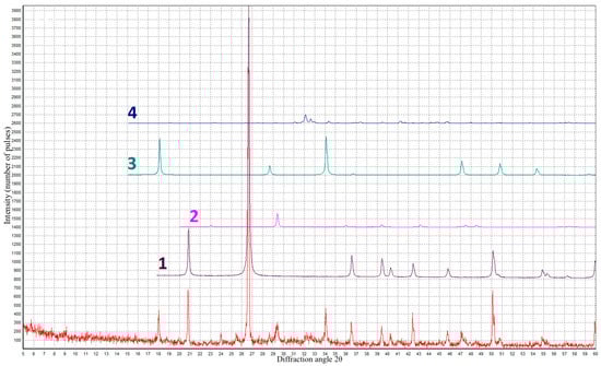 X-ray image of foam concrete with 6% CD: 1—quartz; 2—calcite; 3—portlandite; 4—larnite.