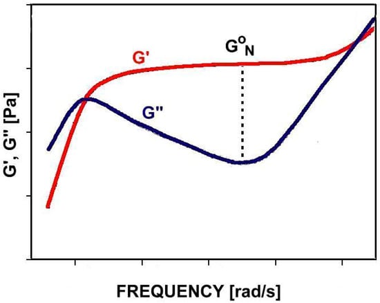 GN0 can be determined by measuring linear viscoelastic properties in an oscillatory shear experiment, performed over a wide range of frequencies and temperatures. GN0 is the value of the storage modulus, G′, at the frequency ωmin, in which the loss modulus, G″, reaches its minimum [] (Figure 1). Since this minimum is not always visible, a number of methods have been developed to circumvent this limitation [,,,].
