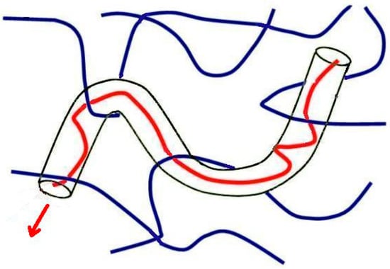 Much effort has been devoted to the theoretical description and modeling of chain motion confined by the presence of other macromolecules [,,,,]. De Gennes [] came up with the idea that the chain movement inside the entangled polymer could be described as snake-like, which is known as the reptation concept. To quantitatively describe the topological constraints caused by chain entanglement, Doi and Edwards [] proposed the tube model. In the simplest version of this model, the polymer chain moves like a snake inside a virtual tube, the diameter of which depends on the constraints imposed by other macromolecules (Figure 2). The movement of the macromolecule perpendicular to the tube is restricted by the tube wall, but its motion along the tube is free. The time of diffusion through the tube is a parameter characterizing the dynamics of the chain [,]. The reptation model provides an interpretation of the observed dependence of viscosity on molecular weight. The improvement of the initial reptation model, taking into account contour length fluctuations and constraint release, has led to progress in approaching the experimental value, η0~M3.4, instead of the value predicted by the original model, η0~M3 [,,,]. Recently, Ransom et al. [], while studying polyisobutylene, suggested that the rheology of polymers with a high number of entanglements per macromolecule (e.g., 430) is closer to the η0~M3 relationship predicted by the original tube theory than to that observed for the lower Mw polymer relationship of η0~M3.4.