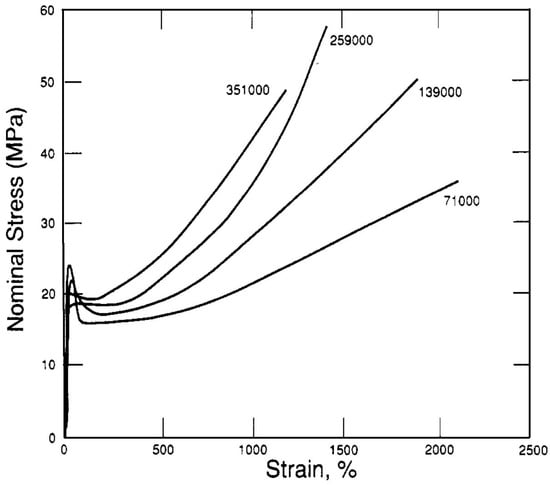 Plot of nominal stress against nominal strain for a series of rapidly quenched linear PEs with the most probable molecular weight distributions. The values of Mw are indicated. A strain-hardening phase is clearly visible []. Reproduced with permission: 1994, American Chemical Society.